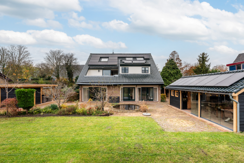 Vanuit de keuken is de verzorgde achtertuin bereikbaar via een deur, inclusief aangebouwde stenen berging en achterom. De achtertuin is netjes betegeld en biedt voldoende ruimte voor verschillende terrassen. De aangebouwde stenen berging en de achterom maken het geheel praktisch en gebruiksvriendelijk.